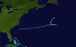 A cold front moved eastward from North America into the western Atlantic Ocean on August 28. An extratropical low developed on August 31 over the north Atlantic, which degenerated into a trough three days later. On September 4, another extratropical storm developed, located about 800 mi (1,285 km) south of Newfoundland. The system attained gale-force winds a day later, and turned westward on September 6, steered by a building ridge to the north. On September 7, the storm transitioned into a tropical storm, after its wind field became more symmetrical. Later that day, the storm attain winds of 60 mph (95 km/h), recorded by nearby ships. The storm turned to the east and northeast, crossing over its former path. On September 10, the tropical storm again transitioned into an extratropical storm, which later passed southeast of Newfoundland. The storm moved across the northern Atlantic Ocean, dissipating on September 13 southwest of Ireland.[4]