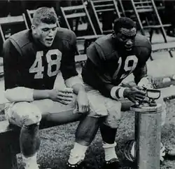 ![]() Michigan quarterback Wally Gabler (No. 29) and halfback Carl Ward (No. 19) | |