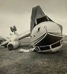 At 3.5 nautical miles (6.5 km) from touchdown, an IFR approach was initiated under the guidance of the radar controller at Lympne. When the aircraft was 0.5 nautical miles (0.93 km) from the airport, it was at an altitude of 220 feet (67 m) above airport level. The captain reported that he could see the end of Runway 20 through the drizzle. At 0.25 nautical miles (0.46 km) from touchdown, the aircraft ran into severe turbulence and drifted to the right of the runway centre-line. Full flap was applied and power was reduced. The aircraft crossed the airfield boundary at 92 knots (170 km/h), reducing to 88 knots (163 km/h) as the landing flare was begun at a height of 40 feet (12 m). As the throttles were closed, the starboard wing dropped and the rate of descent of the aircraft increased. The captain attempted to keep the aircraft level, with the result that it landed heavily.[1] The nose wheel dug into the grass runway, flipping the aircraft onto its back, as the aircraft spun through 180° and ended up facing in the direction from which it had approached;[1] the upside-down aircraft then slid for 400 yards (370 m), ripping off both wings and the starboard tailplane, and crushing the tail.[3]