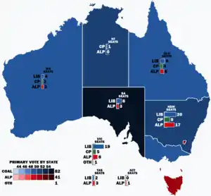 ![]() Popular vote by state and territory with graphs indicating the number of seats won. Seat totals are not determined by popular vote by state or territory but instead via results in each electorate. | ||||||||||||||||||||||||||||||||||||||||