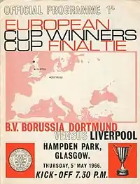 The 1966 European Cup Winners' Cup Final was an association football match between Borussia Dortmund of West Germany and Liverpool of England played on 5 May 1966 at Hampden Park, Glasgow, Scotland. It was the final match of the 1965–66 season of Europe's secondary cup competition, the European Cup Winners' Cup. Both sides were competing in their first European final.