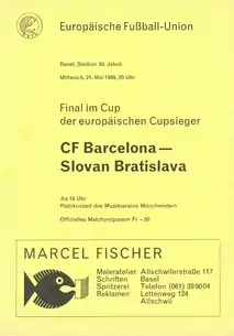 The 1969 European Cup Winners' Cup Final was the final football match of the 1968–69 European Cup Winners' Cup and the ninth European Cup Winners' Cup final. It was contested between Slovan Bratislava of Czechoslovakia and Barcelona of Spain, and was held at St. Jakob Stadium in Basel, Switzerland. Slovan won the match 32 thanks to a goal by Ľudovít Cvetler, Vladimír Hrivnák and Ján Čapkovič.
