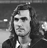 - The Big Look/Soft Look that was high fashion in womenswear from 1973 to 1978 also extended to menswear,[306][307][308][309][310] spearheaded by Giorgio Armani in 1976, who followed womenswear's lead and eliminated the lining and padding from his men's jackets, suits, and trousers, cutting them in natural fibers with enough ease that sleeves and even trouser hems could be easily rolled or pushed up and collars could be turned up.[311] Collars, lapels, and ties were narrow,[312][313] the tie, when worn, often not pulled up high but knotted low to allow for an easy, open neck.[314] Trousers were straight-legged, sometimes even tapered, and often with soft pleats.[315][316] Band-collared shirts were often worn with the look. This style remained dominant in high-fashion menswear through 1978[317][318] and then menswear again followed womenswear's lead and adopted the new big-shoulder looks for 1979. The Soft Look's pushed-up jacket sleeves and turned-up collars, though, would continue into the 1980s in bigger-shouldered, more colorful form.