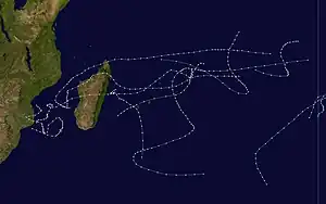 Hermione existed from March 1 to March 11. On March 5, Hermione passed north of the Mascarene Islands, producing heavy rainfall on Réunion that reached 757.5 mm (29.82 in) at Foc Foc.[7]