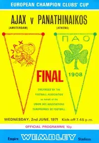 The 1971 European Cup final was a football match between Ajax of the Netherlands and Panathinaikos of Greece on 2 June 1971 at Wembley Stadium. It was the final match of the 1970–71 season of Europe's premier cup competition, the European Cup. Ajax were appearing in their second final, having lost the 1969 final 4–1 to Italian team A.C. Milan. Panathinaikos were appearing in their first final.