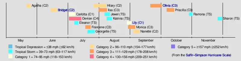 | Bridget | June 14 – 20 | Category 2 hurricane | 100 (155) | 998 | Mexico | 56 | 17 | |||