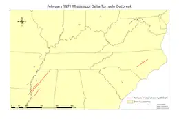 On February 21–22, 1971, a devastating tornado outbreak, colloquially known as the Mississippi Delta outbreak, struck portions of the Lower Mississippi and Ohio River valleys in the Southern and Midwestern United States. The outbreak generated strong tornadoes from Texas to Ohio and North Carolina. The two-day severe weather episode produced at least 19 tornadoes, and probably several more, mostly brief events in rural areas; killed 123 people across three states; and wrecked entire communities in the state of Mississippi. The strongest tornado of the outbreak was an F5 that developed in Louisiana and crossed into Mississippi, killing 47 people, while the deadliest was an F4 that tracked across Mississippi and entered Tennessee, causing 58 fatalities in the former state. The former tornado remains the only F5 on record in Louisiana, while the latter is the deadliest on record in Mississippi since 1950. A deadly F4 also affected other parts of Mississippi, causing 13 more deaths. Other deadly tornadoes included a pair of F3s—one each in Mississippi and North Carolina, respectively—that collectively killed five people.[nb 1][nb 2][nb 3]