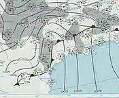 At 12:00 UTC on February 21, 1971, surface weather analysis failed to indicate either a well-developed low-pressure area or a defined frontal boundary over the Gulf Coastal Plain, signs that would normally presage a severe weather outbreak. At the time, a diffuse warm front extended eastward from East Texas to portions of Mississippi, and a cold front extended southward over East Texas. Higher up in the atmosphere, conditions were "close to ideal" for a significant tornado outbreak: a broad trough imparted substantial divergence over the prefrontal warm sector.[10]