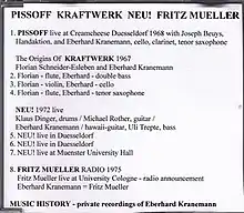 Pissoff was a band founded in the late 1960s by Kranemann and some friends. Eberhard had studied under Beuys, and the artist is featured with Pissoff on the first track, recorded in Düsseldorf's Creamcheese club. Shortly after this recording, Florian Schneider joined the band. An unedited version of this track was also released separately by Kranemann.