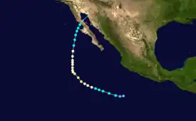 A westward-moving area of squalls south of Mexico organized into a tropical depression on September 30. It then strengthened into a tropical storm and was named Joanne. Joanne moved west northwest, and intensified into a hurricane on October 1. It then peaked as a Category 2 hurricane on October 2. Joanne then slowed down and began to recurve, first to the north, and then the north northeast. While accelerating in that direction, Joanne made landfall near Laguna Chapala on the Baja California Peninsula as a tropical storm.[4] Joanne managed to retain a closed circulation and bring tropical storm force winds to Arizona, the first recorded time that had happened.[10] The tropical storm dissipated inland over Sonora on October 7.[4] Joanne is one of only four known Pacific hurricanes to bring gale-force winds to the Continental United States, and was the first since the 1939 California tropical storm.[11]