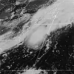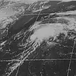 A tropical wave moved off the western coast of Africa on August 30 and acquired sufficient organization to be declared a tropical depression by 18:00 UTC on September 4 roughly 715 mi (1,150 km) east of Guadeloupe. The newly-formed cyclone moved northwest for several days, maintaining its status as a tropical depression despite the absence of a closed low-level circulation in several reconnaissance missions.[27] It eventually intensified into Tropical Storm Elaine east of North Carolina by 18:00 UTC on September 9, and with the aid of light upper-level winds, reached peak winds of 70 mph (110 km/h) early the next morning. Steered northeast by an approaching trough, Elaine interacted with a cold front and transitioned into an extratropical cyclone by 00:00 UTC on September 14 over the northern Atlantic.[3][6]