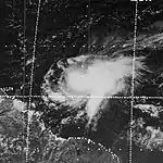 A disturbance developed within the Intertropical Convergence Zone just off the western coast of Africa on September 22. The system moved west-northwest and steadily coalesced, organizing into a tropical depression by 12:00 UTC on September 27 about 985 mi (1,585 km) east-southeast of Barbados. The storm was slow to develop at first, intensifying into Tropical Storm Gertude by 18:00 UTC on September 28. However, a reconnaissance aircraft flight six hours later indicated Gertude had intensified into a hurricane and attained peak winds of 75 mph (120 km/h), although its winds were transient and the storm featured an abnormally high surface pressure. After temporarily stalling, Gertude resumed its west-northwest motion while steadily weakening under the influence of strong upper-level winds. It passed through the southern Leeward Islands on October 2 and dissipated over the eastern Caribbean by 00:00 UTC on October 4.[3][6]