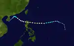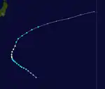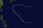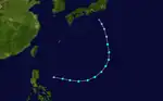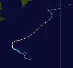 A tropical disturbance developed on January 8 to the southwest of Palau.[1] By the next day, the disturbance was upgraded to a tropical depression and to a tropical storm. Wanda reached its peak intensity on January 10 as a 65 mph tropical storm. The storm was then downgraded to a tropical depression on January 11. Wanda then dissipated on January 14.[3]