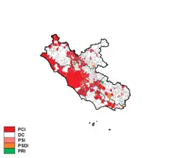 Christian Democracy was narrowly behind the Italian Communist Party. After the election Roberto Palleschi, a Socialist became President of the Region with the support of the Italian Communist Party (Frontism).