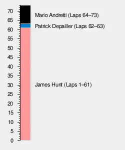 Hunt continued to lead, behind him second place passed between Andretti and Brambilla. On lap 22 Brambilla challenged for the lead but spun out of contention before retiring 15 laps later with electrical problems. Jochen Mass moved into second before crashing on the 36th lap just before turn 7, promoting Patrick Depailler into the position with Andretti third.