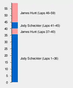 At the front, Scheckter's Tyrrell was losing grip as his fuel load lightened, and Hunt was getting quicker in the chasing McLaren. The gap closed to 1.3 seconds on lap 29, then half a second on lap 30. Finally, on lap 37, Hunt moved inside at the end of the back straight and took the lead. He pulled away by over two seconds in the next two laps, but on lap 41, he missed a gear in the chicane while trying to get around some backmarkers, and Scheckter retook the lead. Hunt passed him again at the end of the straight on lap 46 and held on to claim his sixth win of the season. Six laps from the finish, on lap 53, Hunt set the fastest lap of the race.