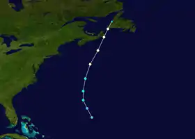A tropical wave emerged into the Atlantic Ocean from the west coast of Africa on October 3. The system tracked westward at an abnormally low altitude of 6°N. However, because the Azores high pressure was abnormally weak, the system quickly curved northwestward. After a significant increase in convection, a tropical depression developed at 1800 UTC on October 13, while located 400 miles (640 km) south of Bermuda. A ship later reported gale-force winds, prompting an upgrade of the depression to Tropical Storm Evelyn on October 14. Early on the following day, a reconnaissance flight recorded winds of 83 mph (134 km/h), indicating that Evelyn became a hurricane. Later on October 15, accelerated to the north-northeast and made landfall on Cape Breton Island, Nova Scotia with winds of 80 mph (130 km/h) at 1200 UTC. Shortly after entering the Gulf of Saint Lawrence, Evelyn merged with a cold front at 1800 UTC on October 15, near the tip of southeastern Newfoundland.[20]