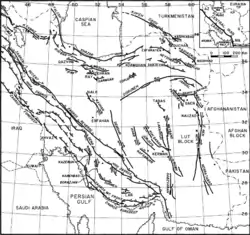 The northeastern boundary of the Zarand plain is well-expressed by a northwest–southeast range front. This also lies the Kuh Banan Fault (KBF),[4] a steep, east-dipping thrust fault measuring 300 km (190 mi) in length and strikes northwest–southeast. It caused the uplift of late Precambrian and Lower Paleozoic rocks over younger Quaternary alluvium. The fault showed active thrusting in the early Quaternary.[5] The eastern side of the KBF is the mountainous range front which is likely the result of the uplift it caused. The KBF is part of a north–south to northwest–southeast striking system of right-lateral faults. These faults accommodate less than 5 mm (0.20 in)/yr of right-lateral deformation between central Iran and the Lut desert.[4]