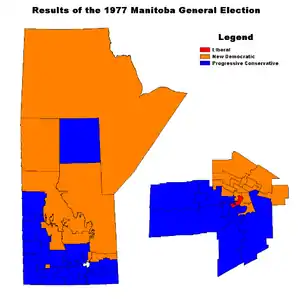 The 1977 Manitoba general election was held on October 11, 1977 to elect Members of the Legislative Assembly of the Province of Manitoba, Canada. It was won by the Progressive Conservative Party, which took 33 seats out of 57. The governing New Democratic Party fell to 23 seats, while the Liberal Party won only one seat.