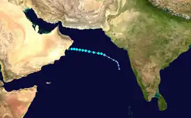On June 6, a monsoon depression formed in the Arabian Sea about 500 km (310 mi) south-southwest of Goa, India. It initially paralleled the Indian coastline, becoming a tropical storm on June 9 with a minimum barometric pressure of 986 mbar (29.1 inHg).[1] That day, the Joint Typhoon Warning Center (JTWC) began tracking the system. The storm moved northward, followed by a northwest turn on June 10.[2] It curved toward the west, and the JTWC reported the cyclone as reaching peak 1–minute sustained winds of 110 km/h (68 mph) on June 11.[2] In addition, the India Meteorological Department estimated the system became a severe cyclonic storm, which has sustained winds of at least 118 km/h (73 mph).[3] On June 12, the storm attained a minimum pressure of 975 mbar (28.8 inHg) while continuing westward.[1]