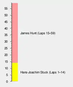 Immediately, Scheckter began to take advantage of the others' uncertainty in the conditions and, by lap five had moved from ninth to fourth. Stuck was also going well in the wet, and, despite losing his clutch cable in the first few laps, pulled away from Hunt. Lauda passed his teammate Reutemann for fifth spot when the Argentine spun. On lap 15, with Hunt four seconds behind, Stuck, struggling to make gear changes without a clutch, popped out of gear entering a corner and went straight on. He retired with damage to the monocoque.
