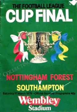 The 1979 Football League Cup Final took place on 17 March 1979 at Wembley Stadium. It was the nineteenth Football League Cup final and the thirteenth to be played at Wembley. It was contested between Nottingham Forest and Southampton. Forest were the hot favourites to win being the holders of the League Cup and the reigning First Division champions. The match finished 3–2 to Forest. Forest's goals came from Garry Birtles (2) and Tony Woodcock. Southampton's goals came from David Peach and Nick Holmes.[1]