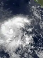 Ignacio turned north and then veered sharply east, entering colder waters. Subsequent reconnaissance of the storm found various changes to its internal structure, including a pinhole eye down to 6 miles (9.7 km) in diameter before it ultimately became ill-defined. Ignacio accelerated toward the Mexico coastline, and around 12:00 UTC on October 30 struck about 160 miles (260 km) east-southeast of Manzanillo, Colima, with much-weakened winds of 35 mph (56 km/h).[3] It transitioned into an extratropical cyclone six hours later, then dissipated over the Yucatán Peninsula the next day.[5][3]
