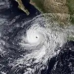 Over two weeks after the dissipation of Hilda, a new tropical disturbance formed southwest of Guatemala on October 22. It tracked steadily westward, becoming a tropical depression around 18:00 UTC on October 23 and Tropical Storm Ignacio at 12:00 UTC the next day. A curve toward the northwest brought the cyclone over progressively warmer waters,[3] and it reached hurricane intensity around 18:00 UTC on October 26. Ignacio soon thereafter began a period of rapid intensification, vaulting from Category 2 to Category 4 intensity within six hours.[5] A United States Air Force reconnaissance plane investigated the powerful storm at 18:00 UTC on October 27, finding peak winds of 145 mph (233 km/h) – tied with Enrique as the strongest of the season – as well as a 25-mile (35-km) diameter eye covered only by broken low-level clouds.