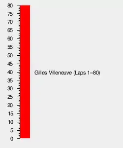 Villeneuve continued to run untroubled in the lead, expanding his margin whenever he chose and setting the race's fastest lap before half-distance. The battle for second, however, was fierce as Jarier, Scheckter, Depailler, Andretti and Jones formed a massive train. Jarier was fighting a wheel vibration and holding everyone up, but no one could pass him on the straight.