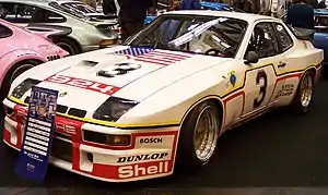 Instead Porsche arrived with three cars in the GTP category. The 924 Carrera was not meant for contesting outright victory but as a preamble for Group 4 and customer sales. Until homologation came through, it had to compete in GTP – as a true GT prototype. This was a significant step for Porsche, as these were their first front-engined cars to compete at Le Mans.[2] The 2-litre turbo engine produced 320 bhp but the heavier weight of the car only got it to 280 kp/h (175 mph). This could be compensated for, to an extent, by its excellent handling and good fuel economy (22 laps on a tank of fuel compared to just 12 laps for a 935).[21] Unusual for the time, the cars were equipped with onboard pneumatic air-jacks.[22] For the three markets, they were given German, British and American crews respectively: test driver Günther Steckkönig joined Jürgen Barth and Manfred Schurti in one; Andy Rouse/Tony Dron had the second while American endurance experts Peter Gregg/Al Holbert had the third.[23][24]