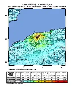 The 1980 El Asnam earthquake occurred on October 10 at 13:25:23 local time with a moment magnitude of 7.1 and a maximum Mercalli intensity of X (Extreme). The shock occurred in the Algerian town of El Asnam (now known as Chlef). The shocks were felt over 550 km (340 mi) away, with the initial earthquake lasting 35 seconds.[5] It was the largest earthquake in Algeria, and was followed three hours later by a magnitude 6.2 aftershock. The earthquake created about 42 km (26 mi) of surface rupture and had a vertical slip of up to 4.2 m (14 ft). No foreshocks were recorded.[5] The earthquake was found to have occurred very close to the epicenter of the 1954 Chlef earthquake using joint epicenter determination techniques.[6][7] It occurred at a previously unknown reverse fault.[8]