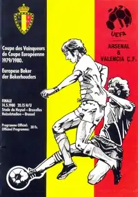 The 1980 European Cup Winners' Cup Final was a football match contested on 14 May 1980 between Valencia of Spain and Arsenal of England. The final was held at Heysel Stadium in Brussels, Belgium. Valencia won the match 5–4 on penalties.[1] It was the 20th European Cup Winners' Cup final and the only time that the winner was decided by a penalty shoot-out. It was Valencia's third major European title after their two Inter-Cities Fairs Cup victories in the 1960s.