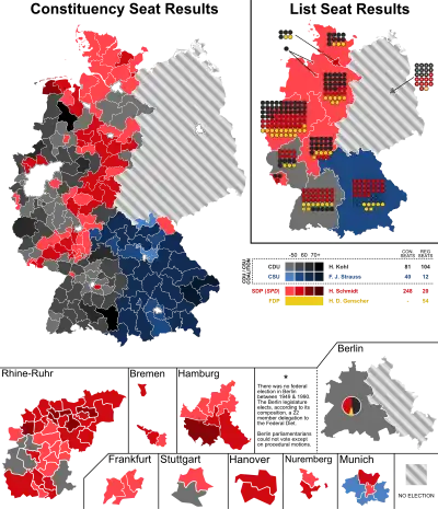 ![]() The left side shows the winning party vote in the constituencies, the right side shows the seats won by parties in each of the states. The pie chart over West Berlin shows the partisan composition of its legislature. | |||||||||||||||||||||||||||||||||||||