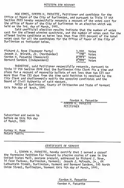 Paquette had easily won reelection to the mayoralty in the 1973, 1975, and 1979 elections and the Democratic Party controlled ten of the thirteen city council seats. Sanders ran in the election due to the amount of support he received in Burlington during his 1976 gubernatorial campaign. Bove initially ran as a Democrat, but became an independent after losing in the primary to Paquette. The Republican Party did not field a candidate and the Citizens Party endorsed Sanders after failing to run Greg Guma. Sanders initially led Paquette by twenty-two votes, but his total vote lead was later decreased to ten votes following a recount.