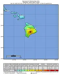The earthquake was recorded by seismic stations in and around Kaoiki, recording a moment magnitude of 6.7 Mw , as well as recordings in other magnitude scales; magnitudes of 6.6 ML ,[2] 6.6–6.7 Ms ,[5][6] and 6.4–6.6 Mt [4] respectively. The Hawaiian Volcano Observatory (HVO) recorded vertical accelerations of up to 0.67 g and assigned a maximum intensity of IX (Violent) on the Modified Mercalli intensity scale.[7] According to reports, the strong oscillations lasted for almost one minute. Following the trend of the originated Kaoiki fault, as well as earthquake data from the nearby HVO Station in Hawai'i National Park, the earthquake is suggested to have a focal mechanism of right-lateral strike-slip with a northeast–trending nodal plane.[7] The sufficient inflation at the Mauna Loa and Kilauea magma reservoirs had enough parallel horizontal compressional stress to snap the strike-slip faulting regions in-between the slopes. Crustal right-lateral faulting with en echelon extensions were found on the 1,900 meter elevation at Mauna Loa road, tracing 4.5 km on both sides of the road, with extensions at lengths of about 20–30 cm (7.87 in) on the main fracture.[8]