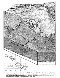 One of the most active faults in the Mauna Loa trend is the Kaoiki fault. Located at the northernmost head of the volcano, but also lying within the lowest areas of the block. Earthquakes associated with the fault are known for creating multiple ground ruptures in an east-west fashion, mostly paired with left-stepping from other adjacent ruptures, and causing open ruptures of up to 0.5 m.[1] This right-lateral strike-slip fault has long coexisted with the volcanic low-angle seaward normal faults within the Hilina slump for approximately 30,000 years.[4]