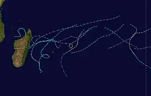 During the season, advisories were issued by Météo-France's (MFR) meteorological office at Réunion. At the time, the MFR area of warning responsibility was from the coast of Africa to 80° E, and the agency primarily used the Dvorak technique to estimate the intensities of tropical cyclones.[1] The Joint Typhoon Warning Center (JTWC), which is a joint United States Navy – United States Air Force task force that issues tropical cyclone warnings for the region,[2] also tracked a long-lived tropical storm in November in addition to the 8 storms MFR named,[3][4][5][6][7][8][9][10][11] which is comparable to the average of nine named storms per year.[12] Following the season, the boundary for the basin was extended to 90° E.[13]