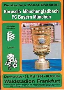 The 1984 DFB-Pokal Final decided the winner of the 1983–84 DFB-Pokal, the 41st season of Germany's premier knockout football cup competition. It was played on 31 May 1984 at the Waldstadion in Frankfurt.[2] Bayern Munich won the match 7–6 on penalties against Borussia Mönchengladbach, following a 1–1 draw after extra time, to claim their seventh cup title.