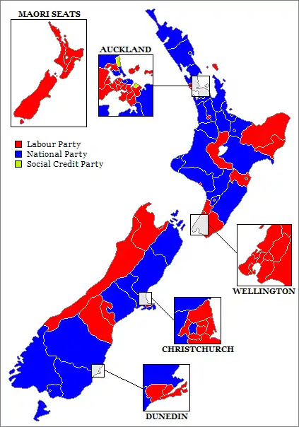 The only minor party to win electorates was the Social Credit Party, which won East Coast Bays and Pakuranga (both in Auckland). It had held East Coast Bays before the election, but won Pakuranga for the first time. It did not manage to retain Rangitikei, which it had also held before the election. Social Credit candidates were placed second in six electorates, including Rangitikei.