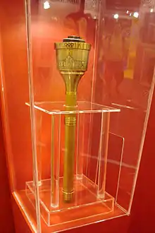 The aluminum torch, designed with a brass finish and leather handle that gave it an antique look, was 56.5 centimeters (22.2 in) long and weighed 1,000 grams (35 oz).[3] Etched on the ring of the torch were the words of the Olympic motto ("Citius, Altius, Fortius") with the Olympic rings between each word. They were manufactured by Turner Industries and each one was numbered.[4]