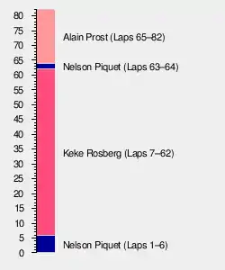 Mansell yielded the lead to Senna's Lotus at the second corner on lap 1 and fell behind both Piquet and Rosberg on the same lap. Piquet also overtook Senna on lap 1 to take the lead but it would last only six laps as on lap 7, Rosberg took the lead from Piquet and began to build a sizeable gap between himself and the rest of the field.