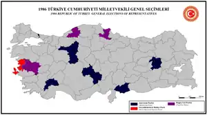 The governing Motherland Party (ANAP) won the most votes, winning 32.1% of the vote and 6 of the 11 seats up for election. The newly formed True Path Party (DYP) led by Hüsamettin Cindoruk came second with 23.5% and won 4 seats. Since ANAP and the DYP were both centre-right parties, their campaigns caused a vote split, which resulted in a reduction in the popular vote of the ANAP since the 1983 general election. The Social Democratic Populist Party (SHP) came third with 22.7% and won the remaining seat, with the party's leader Erdal İnönü becoming an MP for İzmir.[1] All provinces elected a single MP apart from Manisa, where two MPs were elected. In addition to İnönü, the leader of the DYP Hüsamettin Cindoruk was also elected as an MP for Zonguldak.