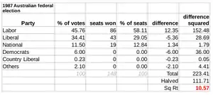 The 1987 federal election was called 6 months early by Prime Minister Hawke to capitalise on the aforementioned disunity in the opposition. The nominal trigger for the double dissolution was the rejection of legislation for the Australia Card by the Senate, but it did not figure prominently in the campaign, and Labor Senate Leader John Button even burst into laughter when referring to it in his speech announcing the election. Caught off guard by the early election, the opposition quickly ran into difficulties when the funding for its flagship tax cut proposals was revealed to have been miscalculated by some $540 million (at the time), a mistake brought up by the Labor party and conceded by Howard.[8] Furthermore, although the Joh for Canberra push had been abandoned, the resulting schism between the Nationals and Liberals led to several three-cornered contests and the National Party ran independent Senate tickets in every state except New South Wales.[9] Labor therefore chose to campaign strongly on the disunity amongst the opposition parties, contrasting it with the relative unity of purpose of the Labor Government. However, aside from these issues, the 1987 campaign failed to generate great excitement on the part of the electorate, and the opposition was viewed as unlikely (particularly in view of the infighting that had recently taken place on the conservative side of politics) to be able to remove the Labor party from power. This was a view strengthened by much of the polling during the campaign, which generally showed Labor with a commanding lead.[10] This election was the last time the Liberals and Nationals competed directly against each other in a federal election.
