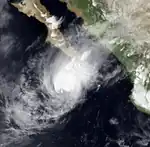 Otis originated from the a tropical disturbance embedded in the monsoon trough. It moved over the warm waters south of the Mexican Riviera from September 17 to September 19. At 0000 UTC September 20, the disturbance was upgraded into Tropical Depression Nineteen-E while moving to the northwest.[5] It strengthened into a tropical storm later that day while located 950 mi (1,530 km) southwest of La Paz.[3] Eighteen hours later on September 21, Otis intensified into a hurricane.[5] It also began to turn back to the west and began to undergo a period of rapid deepening. On September 22, Otis reached its peak windspeed of 115 mph (185 km/h).[5] It would oscillate irregularly between that strength and Category 2 intensity until September 24.[3] That day, it began accelerating to the west as it lost strength due to increased wind shear and decreasing ocean temperature.[5] Otis fell to tropical storm strength on September 25 and a depression on September 26, and dissipated shortly after that.[3]