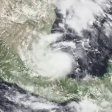 Drifting west-northwest over the Gulf of Mexico, the depression organized and reached tropical storm-strength early on September 2. Later that day, based on observations from aircraft reconnaissance, Debby was upgraded to a hurricane.[32] At peak intensity, the hurricane's center was just 30 mi (48 km) from the coast. With little change in intensity, Debby made landfall near Tuxpan, Veracruz, six hours later.[32] The storm brought high winds, inland flooding, and mudslides and caused 10 deaths.[36]