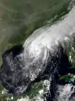 Early in its duration the system dropped moderate amounts of rainfall across the Yucatán Peninsula.[44] Upon striking Louisiana, storm surge water levels rose moderately above normal just east of where the center moved ashore.[45] Gusty winds caused power outages to more than 100,000 people. In Alabama one man died while trying to secure his boat. Rainfall from the hurricane caused severe river flooding in portions of the Florida Panhandle in an area already severely affected by heavy rainfall, and the flooding damaged or destroyed dozens of houses in Santa Rosa County.[46]