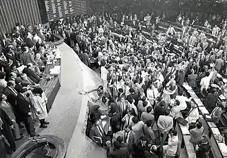 The 1988 Constituent Assembly (Portuguese: Assembléia Constituinte de 1988), also known as the National Constituent Assembly (Portuguese: Assembléia Nacional Constituinte) was a constituent assembly held in Brasília to establish Brazil's new democratic Constitution after 21 years under military rule. In November 1986, general elections were held to elect the members of the Constituent Assembly, which took office on February 1, 1987. Ulysses Guimarães, from the Brazilian Democratic Movement Party (Partido do Movimento Democrático Brasileiro - PMDB) of São Paulo, served as president of the Assembly.