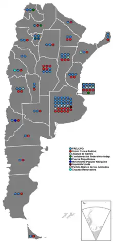 | Chubut | 54,583 | 38.48 | 1 | 39,815 | 28.07 | 1 | 9,681 | 6.82 | — | 25,516 | 17.99 | — | 12,257 | 8.64 | — |