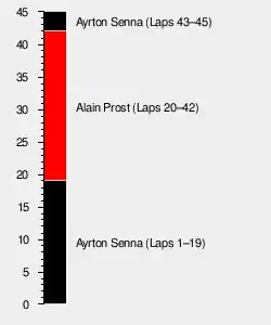 Prost and Senna were on the limit the entire race and Prost hounded Senna for 16 laps, until he went in for his pit stop for tyres, which was a slow one of 18 seconds, which put Mansell in second place and gave Senna a stronger lead. The next lap, Mansell came into the pits for his tyre change and his pit stop was faster than Prost's but still a poor stop of 11 seconds, which dropped him down back to fourth behind, Senna, Pirro and Prost. Senna decided to take advantage of his lead and came into the pits for his tyre change, his stop was even worse than Prost's, lasting 23 seconds. This dropped him down to second behind Prost and Pirro had come into the pits for a tyre change and dropped to fourth.