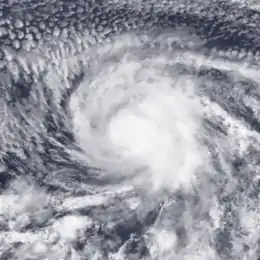 On July 9, a defined low-pressure system formed south of Baja California and increased convective activity led to the NHC classifying it Tropical Depression Six-E on July 11. About 24 hours later, the depression intensified into Tropical Storm Dalilia.[26] By July 13, Dalilia had intensified into a minimal hurricane as it tracked generally toward the northwest. Two days later, the storm took a nearly due west track, which it maintained until July 19.[26] Although the storm tracked near cool waters, a well-developed outflow allowed it to maintain hurricane-intensity.[27] Shortly before crossing into the Central Pacific basin, the storm reached its peak intensity with winds of 90 mph (150 km/h) and a central pressure of 977 mbar (hPa; 28.85 inHg).[26] After crossing 140°W, Dalilia weakened to a minimal hurricane. The storm maintained this intensity until July 19, at which time the system slowed and turned northwest. The following day, the weakening tropical storm brushed the Hawaiian Islands to the south, eventually curving away from the island chain on July 21. Later that day, Dalilia further weakened to a tropical depression, with the Central Pacific Hurricane Center issuing their final advisory at that time. The remnants of the former hurricane continued to track northwest.[21]
